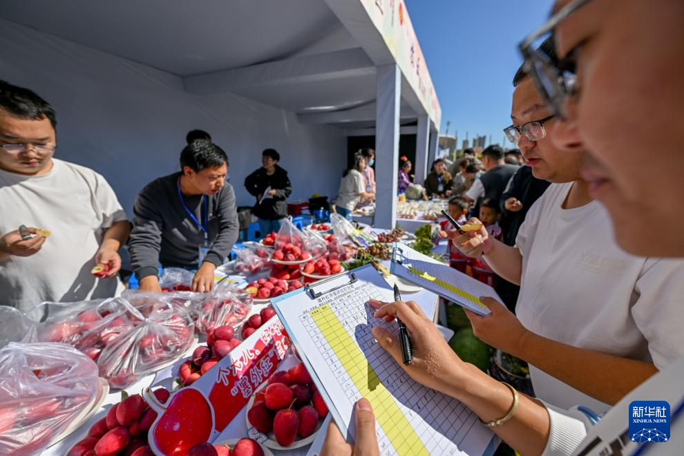 9月22日,评委们对通辽市各类锦绣海棠果进行评比。新华社记者 连振 摄