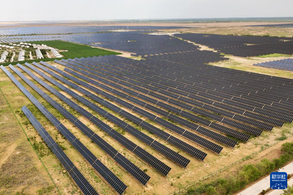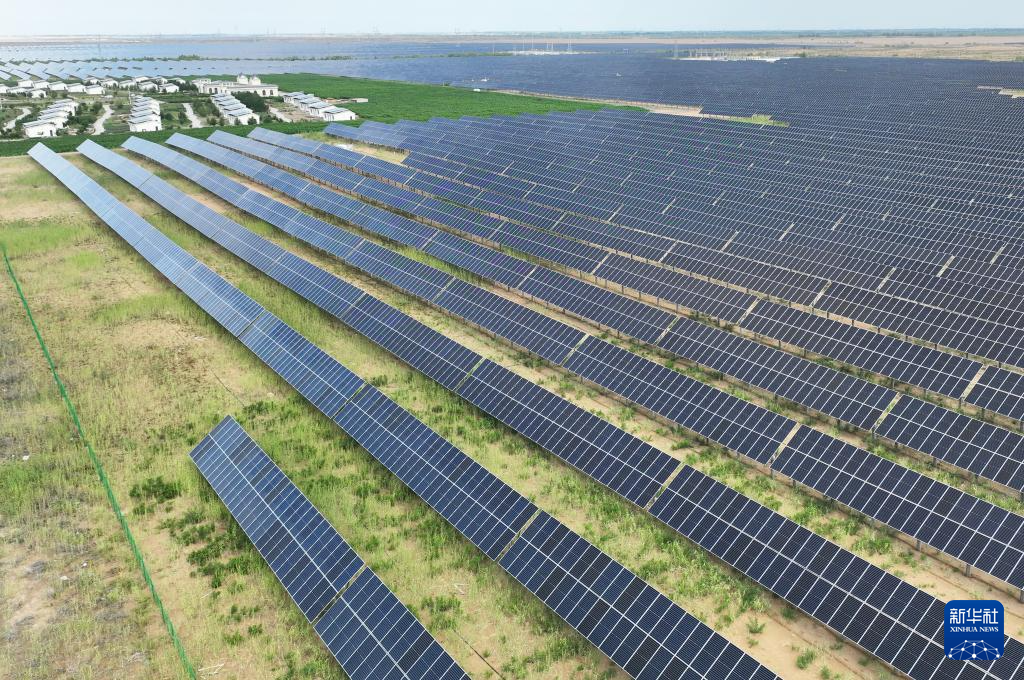 这是7月5日拍摄的内蒙古乌兰布和沙漠防沙治沙和风电光伏一体化项目区(无人机照片)。新华社记者 李云平 摄