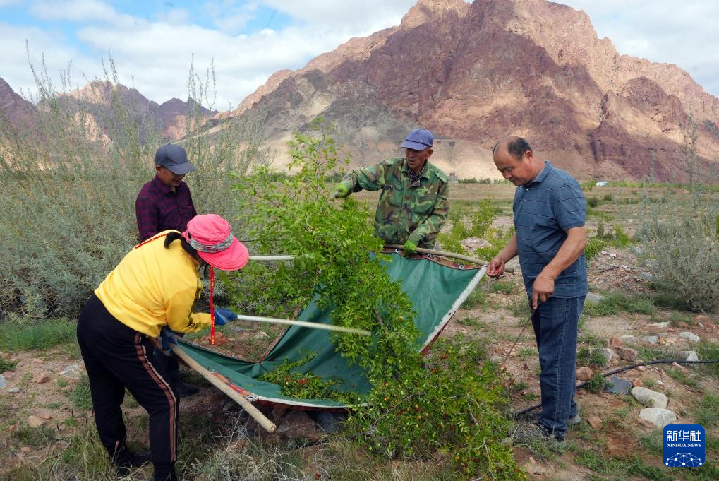 9月26日,内蒙古自治区巴彦淖尔市乌拉特后旗乌兰哈少嘎查村民任二换(右一)和村民一起摘酸枣。新华社记者 李云平 摄