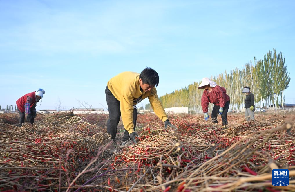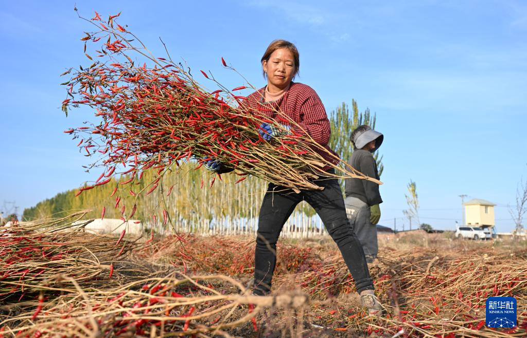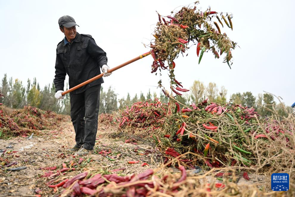 10月16日,农民在内蒙古巴彦淖尔市乌拉特前旗一处农田中翻晒辣椒。新华社记者 刘莲芬 摄