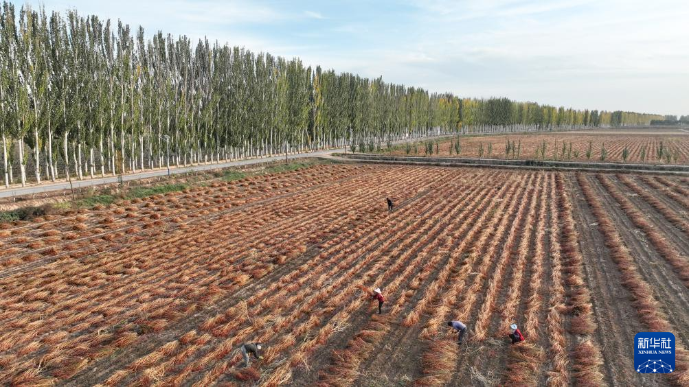 深秋时节,内蒙古河套地区秋收工作进入收尾阶段,农民在田间地头忙碌。