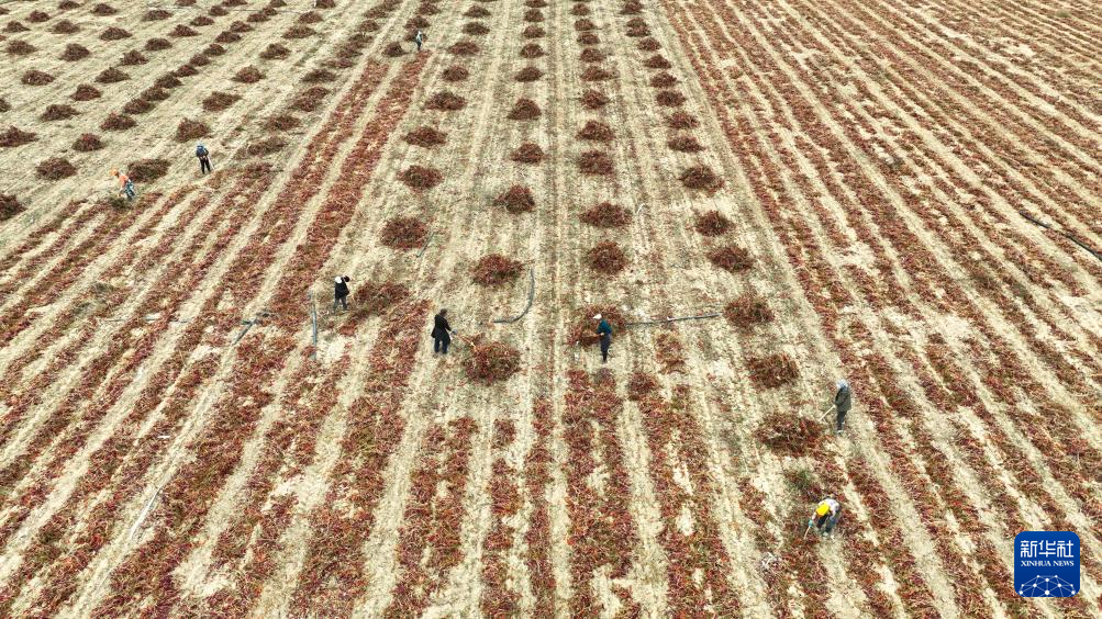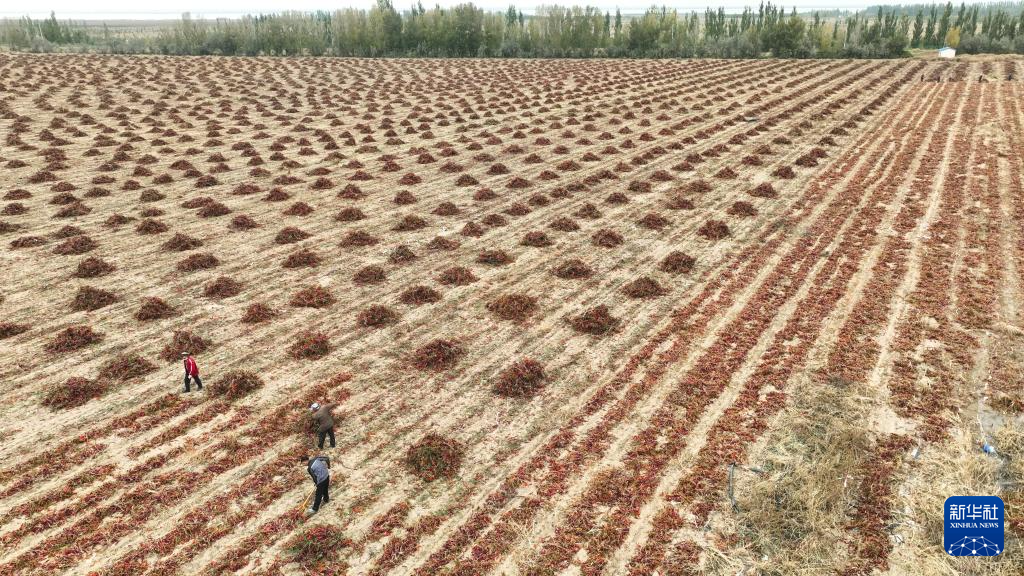 10月16日,农民在内蒙古巴彦淖尔市乌拉特前旗一处农田中翻晒辣椒(无人机照片)。新华社记者 贝赫 摄
