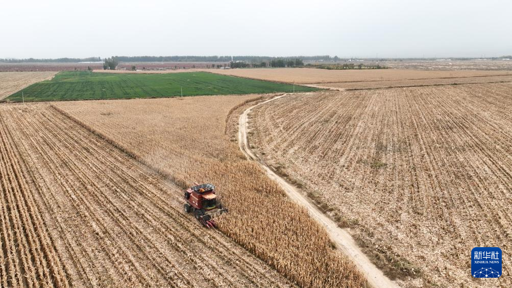 10月16日,农民驾驶农机在内蒙古巴彦淖尔市乌拉特前旗一处农田中收割玉米(无人机照片)。