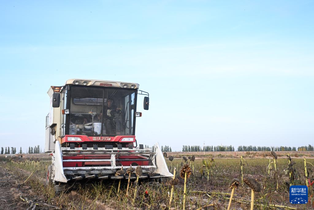 10月15日,农民驾驶农机在内蒙古巴彦淖尔市临河区一处农田中收割葵花。新华社记者 刘莲芬 摄