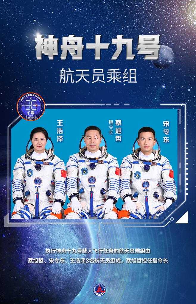 执行神舟十九号载人飞行任务的航天员乘组由蔡旭哲、宋令东、王浩泽3名航天员组成。蔡旭哲担任指令长。