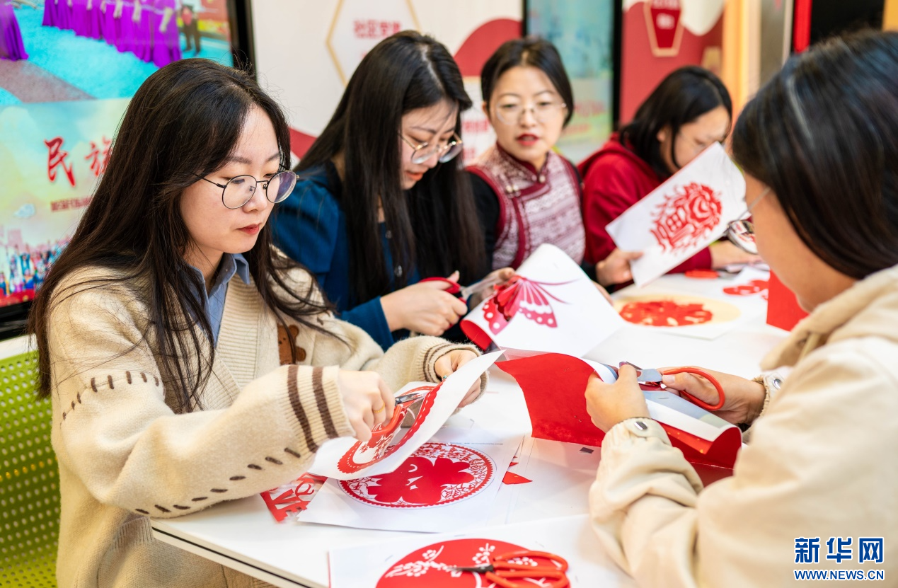 11月7日,工作人员在呼和浩特市玉泉区清泉街社区制作迎立冬窗花剪纸。新华网发(丁根厚 摄)