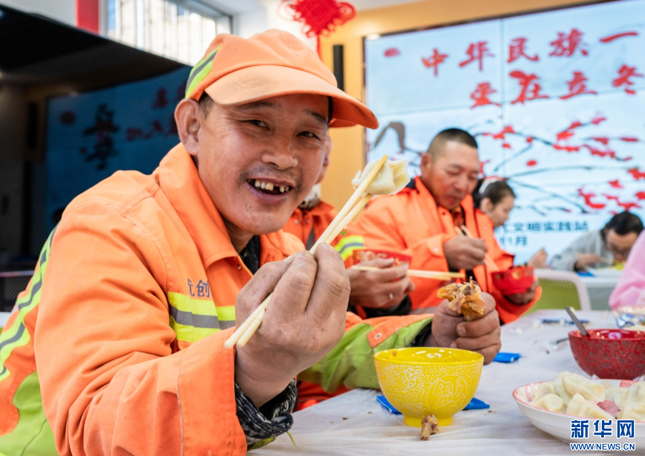 11月7日,环卫工人在呼和浩特市玉泉区清泉街社区品尝立冬饺子。新华网发(丁根厚 摄)