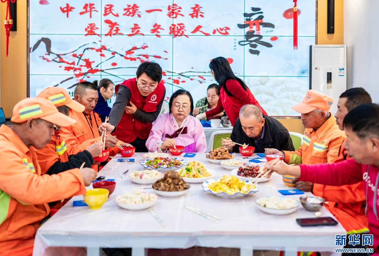 11月7日,环卫工人和社区居民在呼和浩特市玉泉区清泉街社区品尝立冬饺子。新华网发(丁根厚 摄)