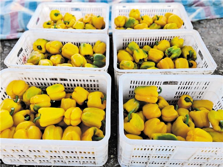 “这片共有29栋智能温室,从国庆节期间就开始采摘,每天的出货量稳定在3000斤以上,主要销往北京、河北等地。”彩椒种植大户、致富带头人宗瑞龙说,黄彩椒每斤12元左右,红彩椒每斤8元左右,最近这段时间可能还会上涨,预计头茬彩椒采收约6万斤。