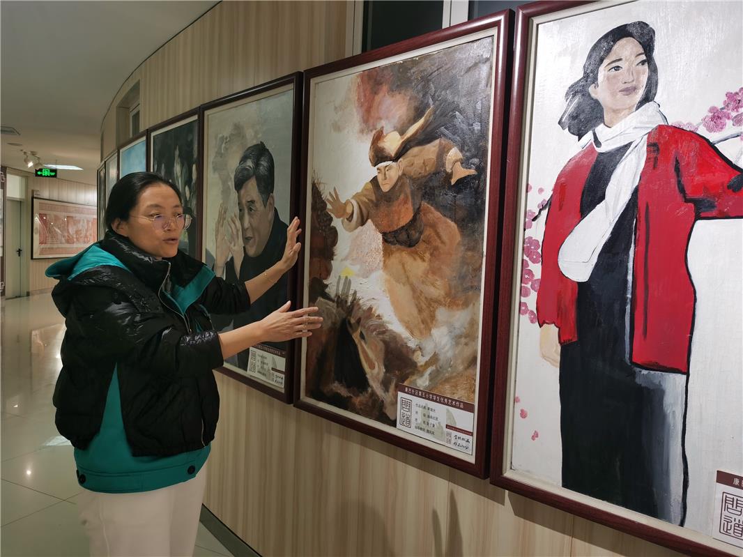 11月22日,走进康巴什区第五小学教学楼,楼道两旁的墙壁上挂满了老师和同学们一起创作的书法、油画、剪纸等作品。一组十几米长的红色剪纸作品《昭君出塞》彰显了铸牢中华民族共同体意识的情怀,袁隆平、杨利伟等十二幅对国家作出突出贡献的代表人物油画作品画得真实、生动,一幅幅苍劲有力的软笔书法作品展示了孩子们的艺术实力和爱国情感。
