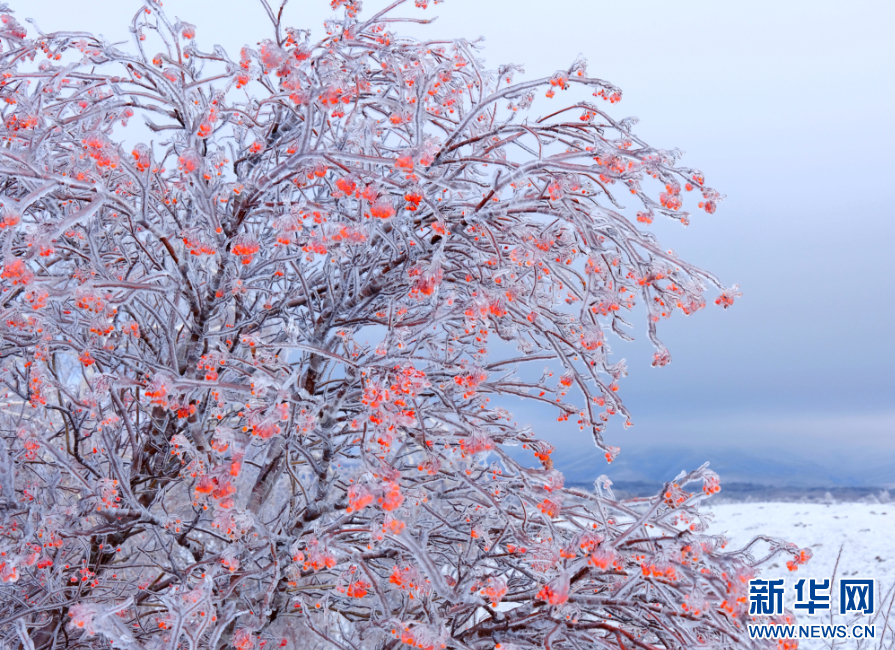 被白雪覆盖的巴林草原上,花楸树的红果留挂枝头。12月18日拍摄于内蒙古巴林右旗索博日嘎镇荣升十八景景区。新华网发(原野牧歌 摄)
