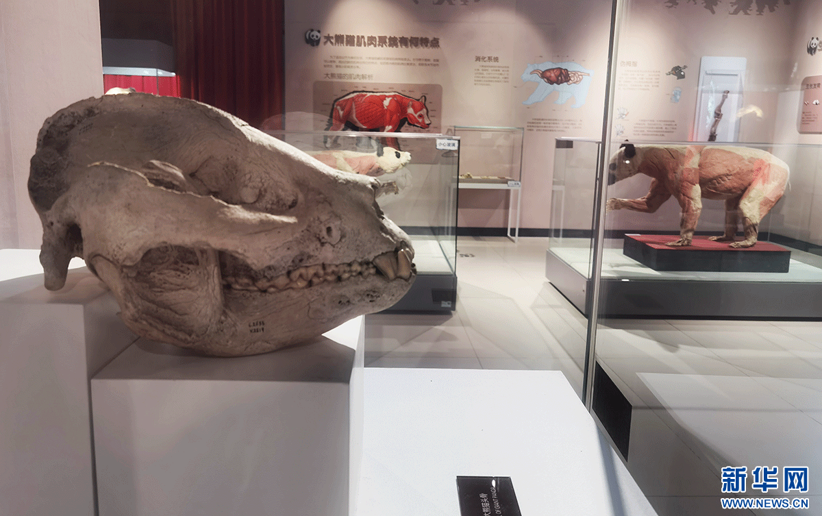 《熊猫时代——邂逅黑白精灵》展上展示的大熊猫头骨。新华网 徐红梅 摄