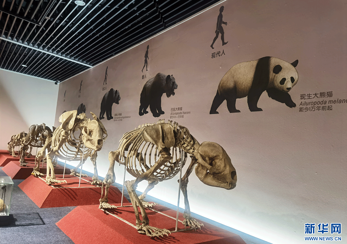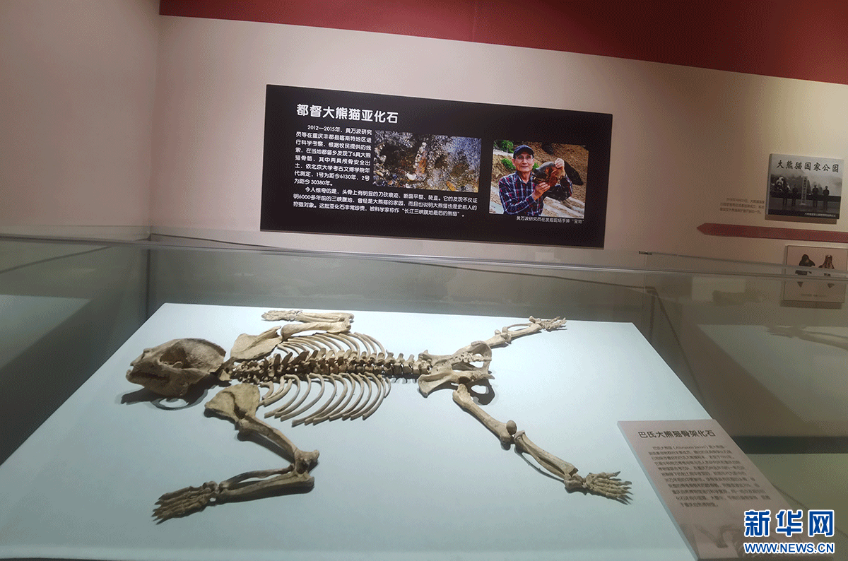 《熊猫时代——邂逅黑白精灵》展上展示的巴氏大熊猫骨架化石。新华网 徐红梅 摄