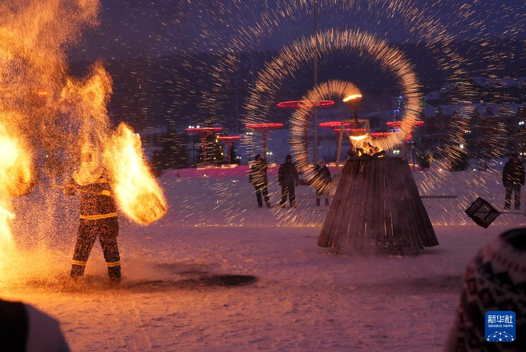 2024年12月30日,游客在阿尔山市圣泉广场观看火壶表演。