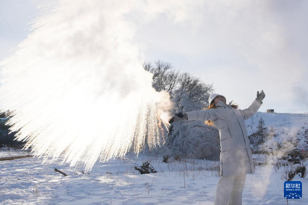 2024年12月31日,在阿尔山国家森林公园,游客体验“泼水成冰”。