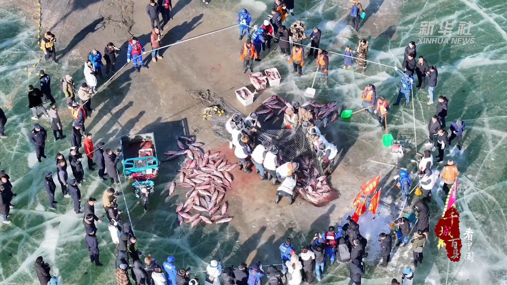在羽龙湖捕鱼现场,随着欢呼声,困在网中的鱼群被从冰层中拉出,一条条硕大的鲜鱼在冰面翻滚跳动,现场一派“鱼跃人欢”的丰收景象。