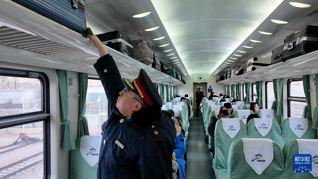 列车员吴昊洋在列车上检查行李是否放稳。新华社记者达日罕 摄
