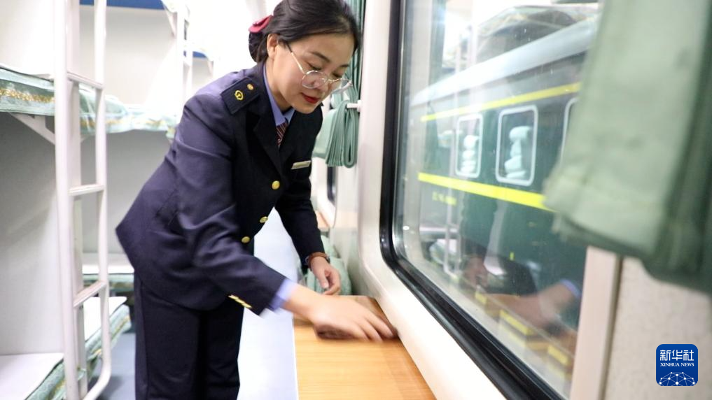 列车员彭丽在列车上进行清洁工作。新华社记者达日罕 摄