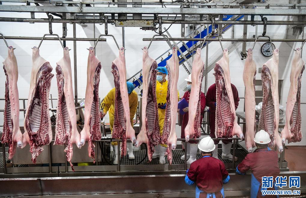 2月11日,在位于和林格尔乳业开发区的正大集团内蒙古食品加工产业园智能化屠宰加工厂,工人在生产线上作业。新华网发(康文魁 摄)