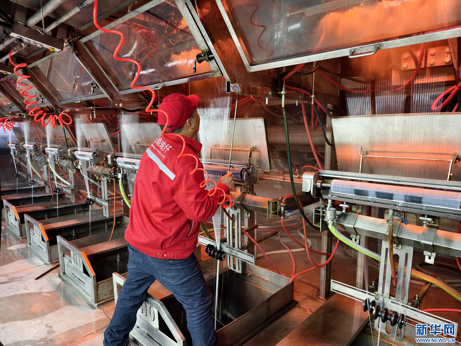 2月11日,在位于和林格尔县的内蒙古天皓玻纤生产项目车间内,一名工人在拉丝机前工作。新华网 杨腾格尔 摄