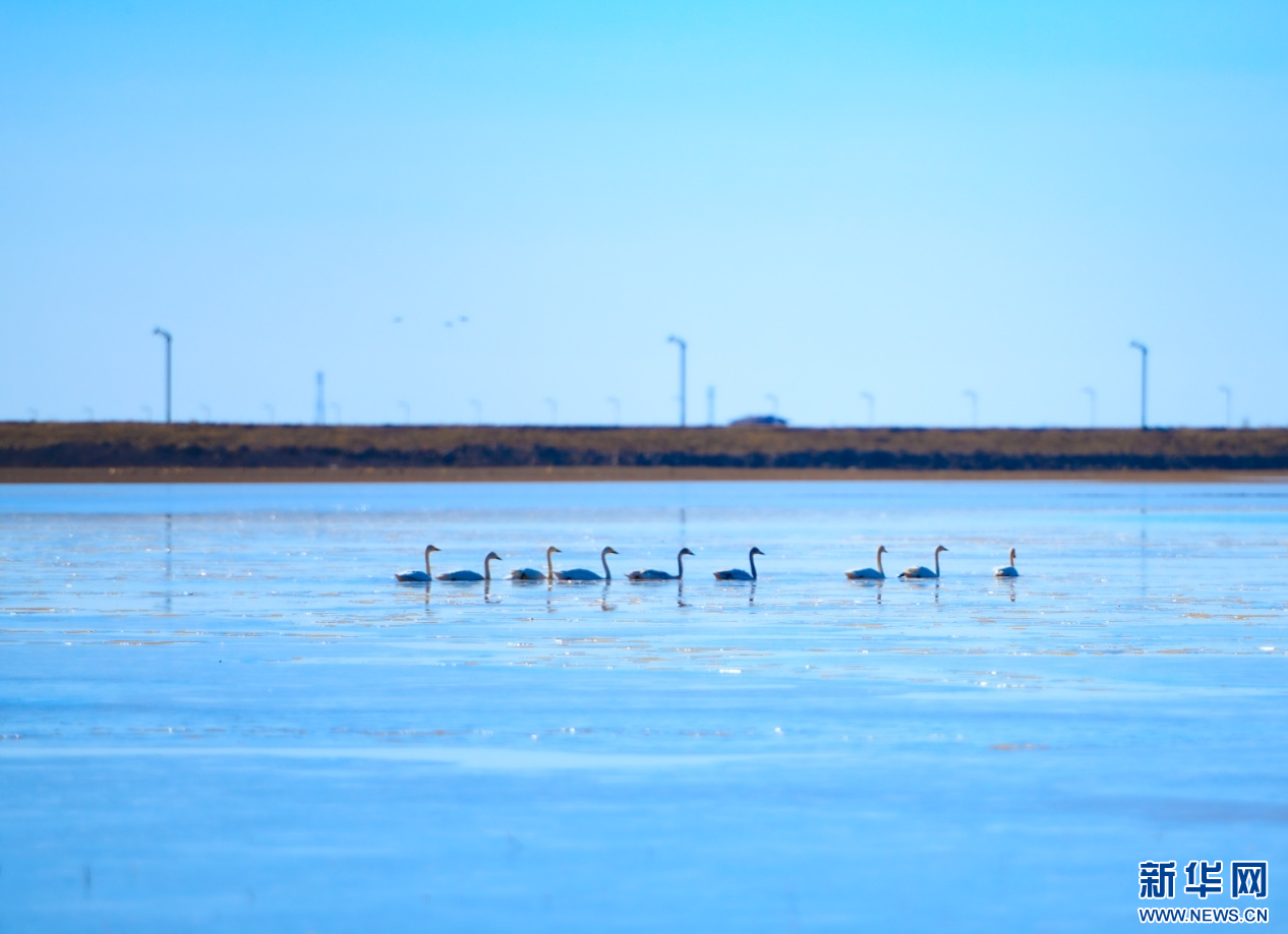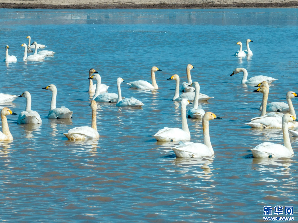 3月18日,天鹅结队在哈素海湖面游弋。新华网发 (杨鑫 摄)