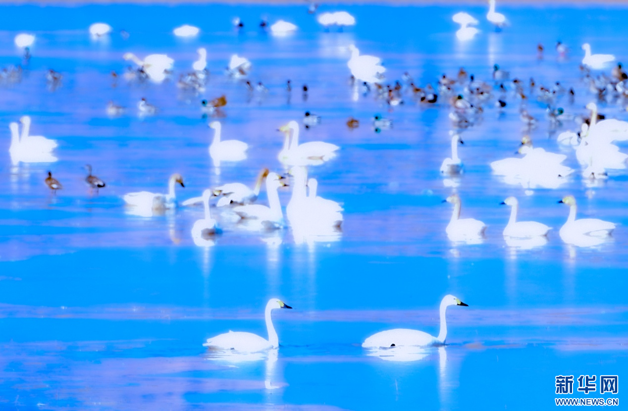 3月18日,天鹅、赤麻鸭在哈素海湖面游弋。新华网发 (阳光 摄)