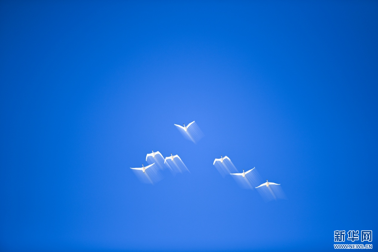 3月18日,天鹅结队在哈素海上空飞翔。新华网发 (阳光 摄)