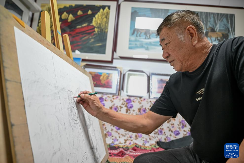 8月10日,在内蒙古扎鲁特旗版画院,扎鲁特版画代表性传承人照那木拉在画室创作。