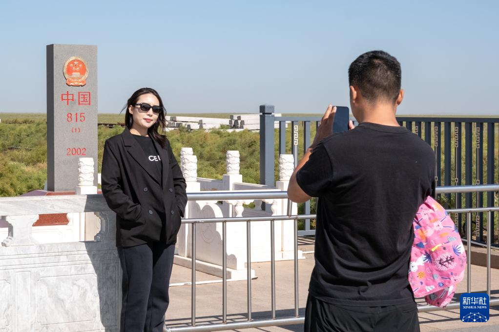9月3日,在内蒙古二连浩特国门景区,游客在界碑前拍照留念。