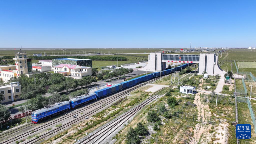 9月3日,一列中欧班列通过内蒙古二连浩特铁路口岸入境(无人机照片)。