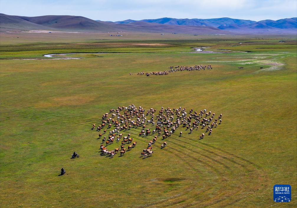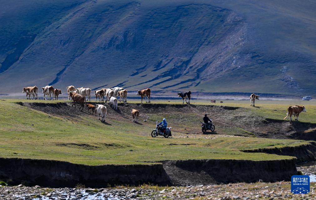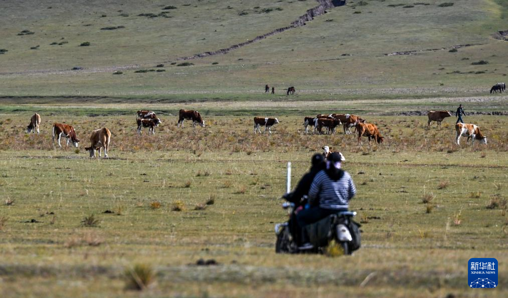 9月20日,都楞宝力高的妻子都冷苏布道带着邻居一起去聚拢牛群。新华社记者 连振 摄