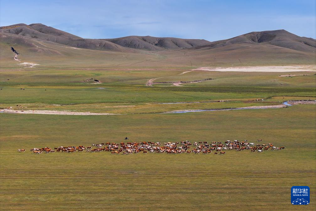 9月20日,都楞宝力高和邻居们赶着牛群,踏上转场归途(无人机照片)。新华社记者 连振 摄