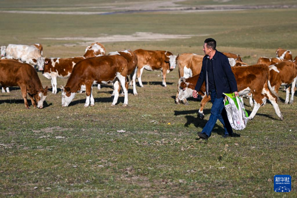 9月19日,都楞宝力高给牛群撒盐块。新华社记者 连振 摄