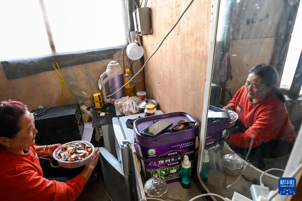 9月19日,在放牧点,都楞宝力高的妻子都冷苏布道把食物放进冰箱,准备第二天启程回家。新华社记者 连振 摄