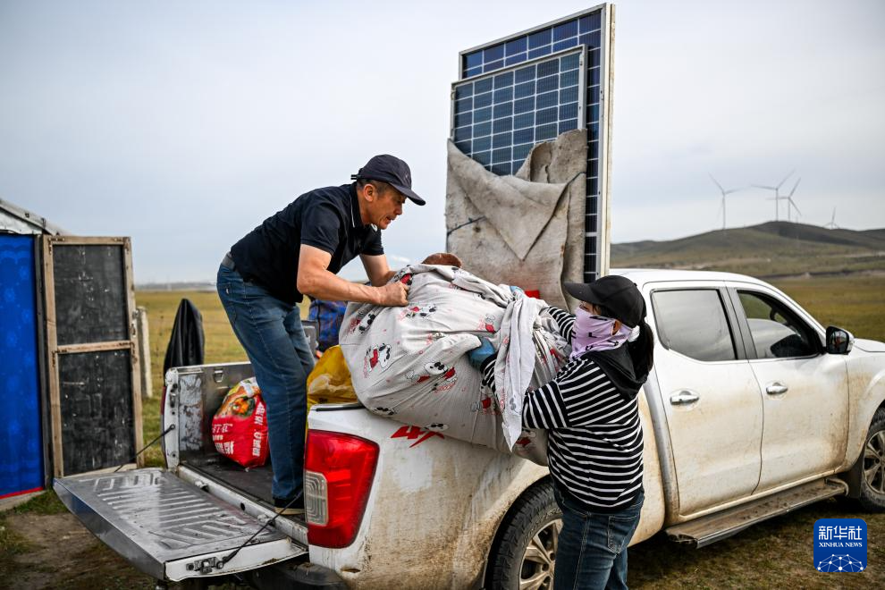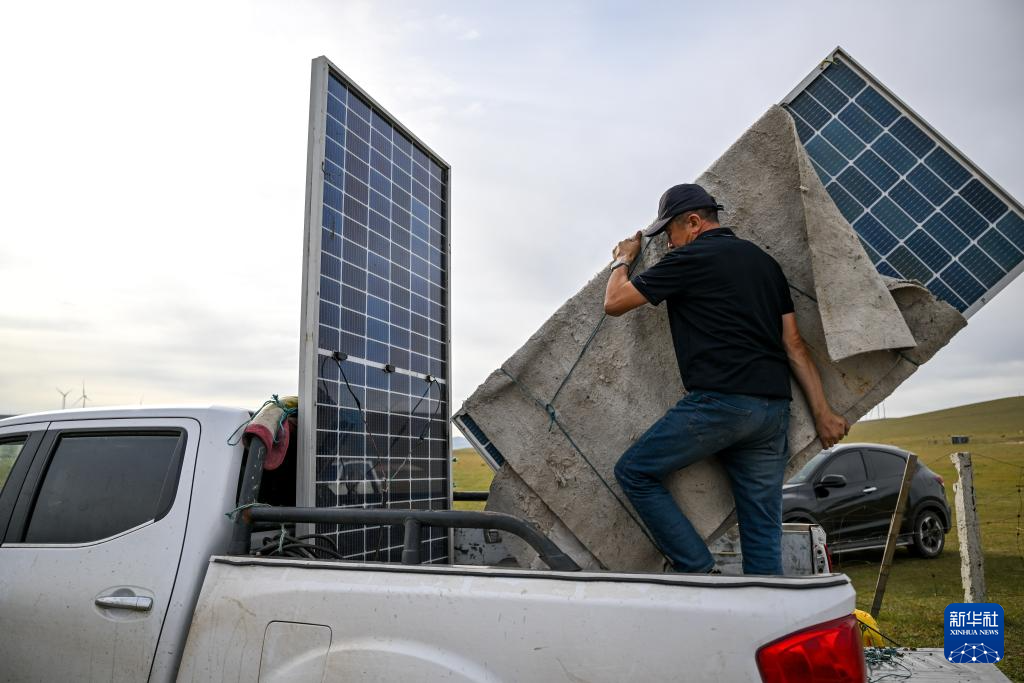 9月20日,都楞宝力高帮助邻居把太阳能板装车。新华社记者 连振 摄