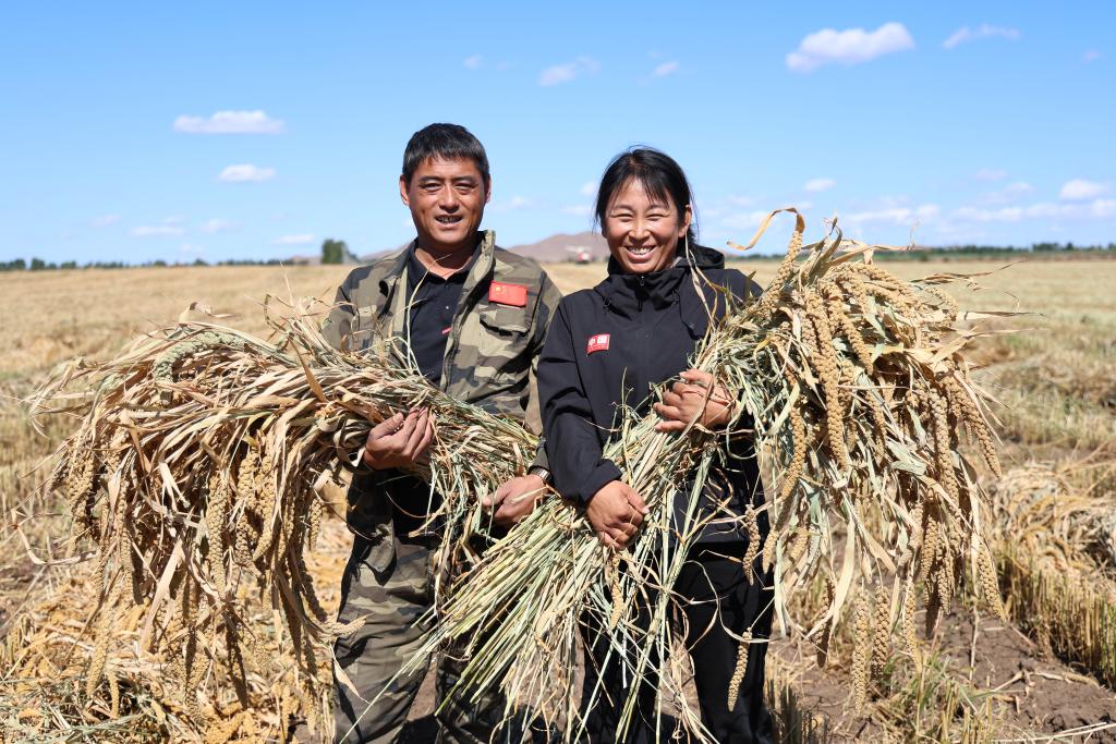 在突泉县艳梁农业机械化种植专业合作社托管种植的谷子地内,随着联合收割机在田间来回穿梭,脱粒、粉碎一气呵成,不一会功夫,沉甸甸、金灿灿的谷子便从收割机仓门倾泻而下,一派高产丰收的秋收景象。