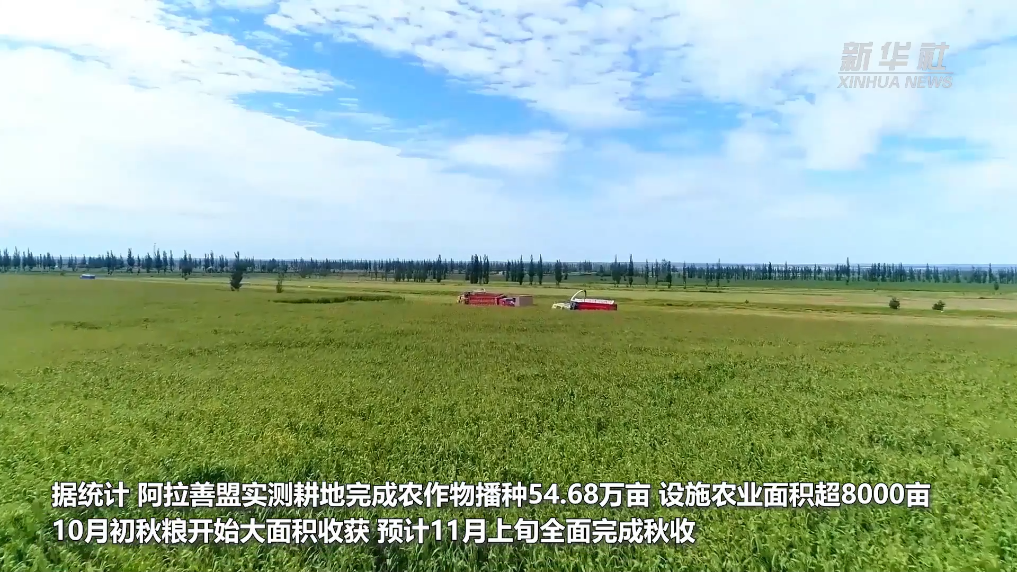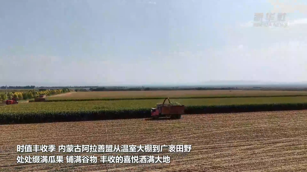 时值丰收季,内蒙古阿拉善盟从温室大棚到广袤田野,处处缀满瓜果、铺满谷物,丰收的喜悦洒满大地。