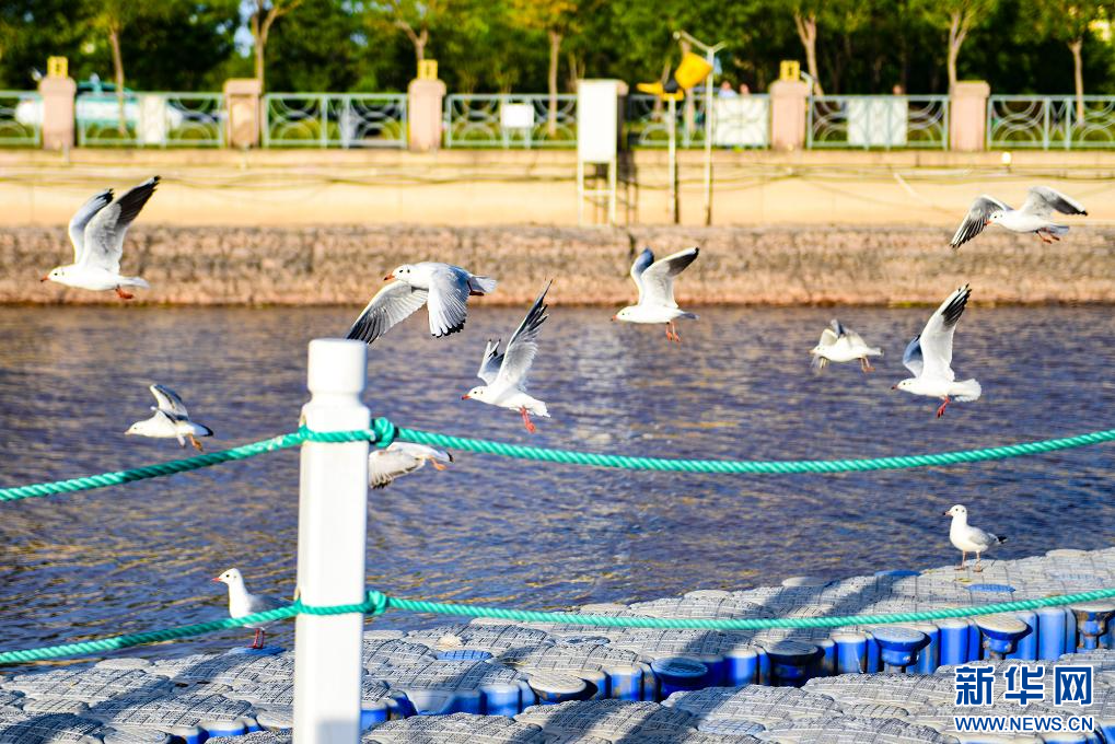 9月23日,一群红嘴鸥在乌海湖畔嬉戏、飞翔。(康文魁 摄)