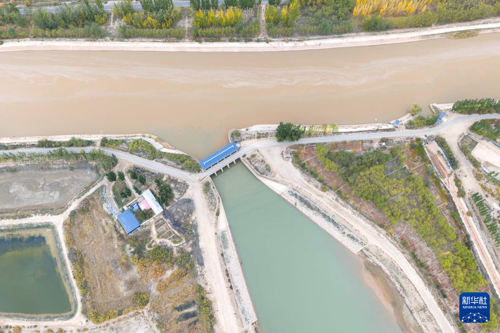 10月16日,用于灌溉的黄河水流经内蒙古巴彦淖尔市磴口县境内的黄河总干渠(无人机照片)。新华社记者 马金瑞 摄