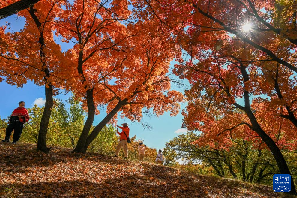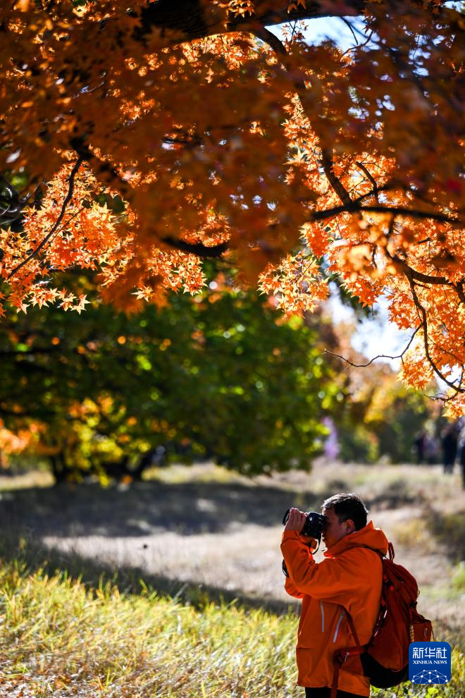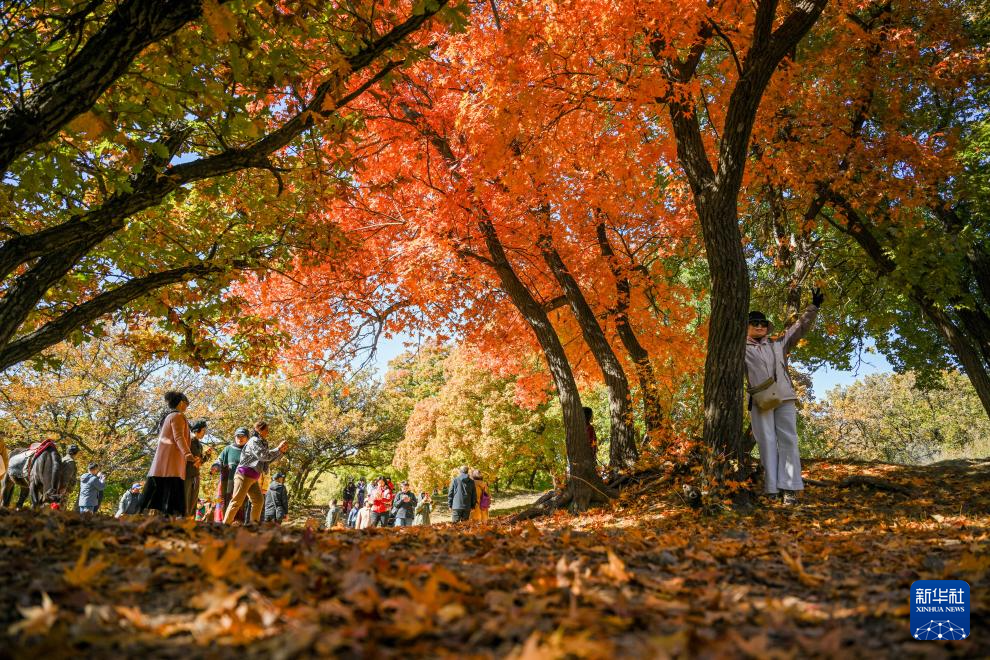 10月18日,游人在乌旦塔拉五角枫森林公园游览。