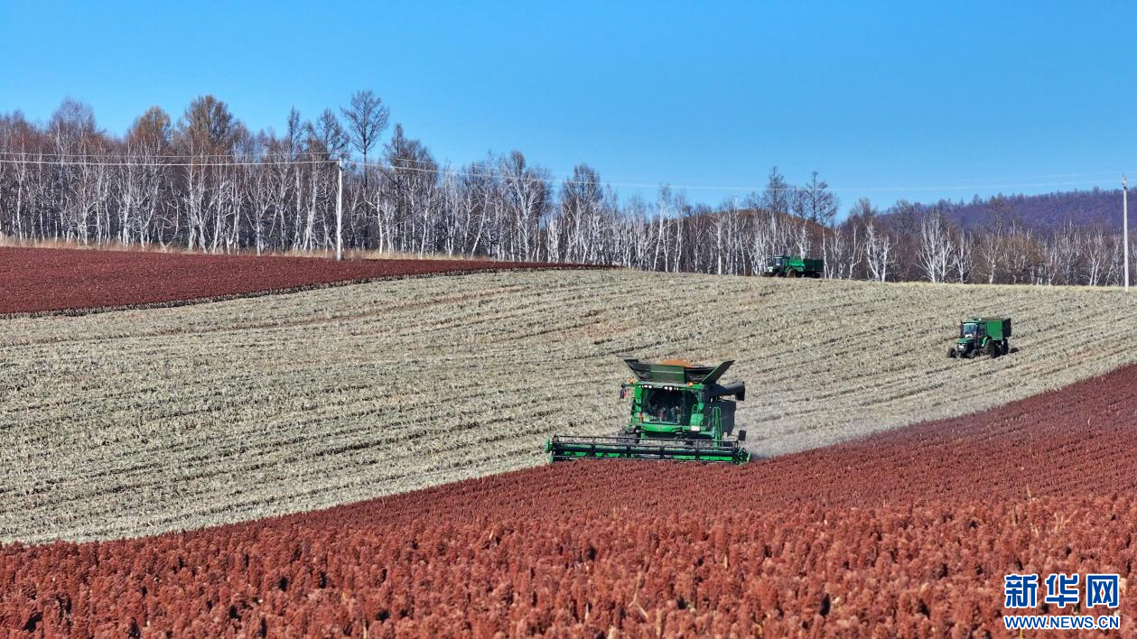 10月22日,在内蒙古自治区呼伦贝尔农垦绰尔河农牧场有限公司田间,农场员工正在收获高粱。新华网发(哈园硕 摄)