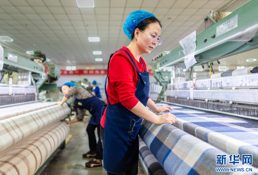 11月11日,内蒙古呼和浩特市玉泉区裕隆产业园精卓羊绒制品有限公司的生产车间内,工人在生产线上赶制羊绒制品订单。新华网发(丁根厚 摄)