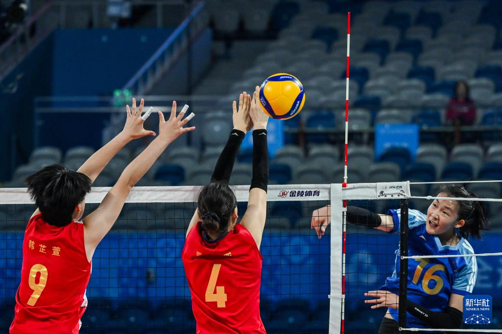 11月13日,内蒙古队球员刘懿萱(左一)在比赛中扣球。