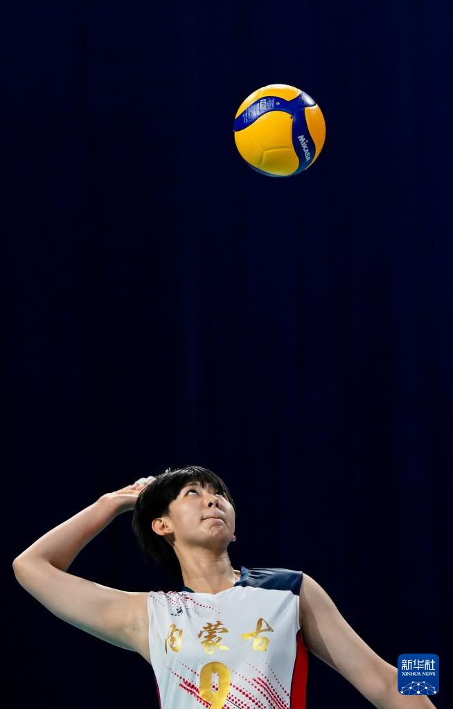 11月13日,内蒙古队球员韩芷萱在比赛中发球。
