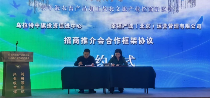 在签约仪式上,乌拉特中旗政府与山东正域农业发展有限公司、内蒙古吉泰恒岳建设集团有限责任公司签署项目合作框架协议。牧洋海牧场有限公司分别与江苏苏智云蟹科技有限公司、巴彦淖尔市汇蒙生态农业科技发展有限公司签署5000亩高品质河蟹养殖项目、1200亩稻蟹共养项目等框架协议。乌拉特中旗投资促进中心与幸福产城(北京)运营管理有限公司签署招商推介会合作框架协议。