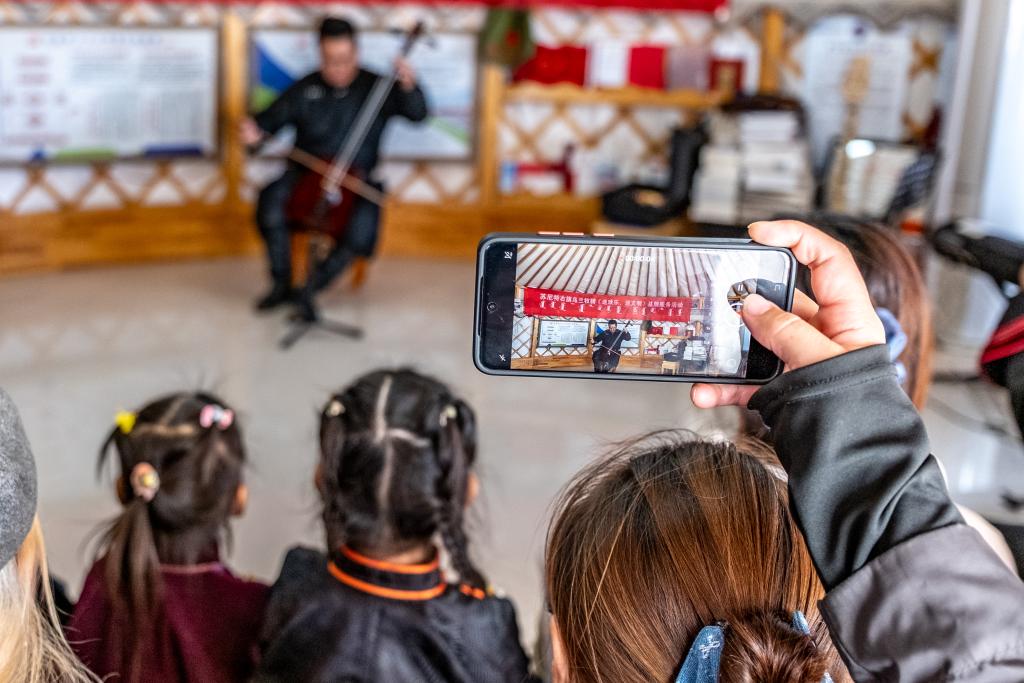 11月12日,在内蒙古锡林郭勒盟苏尼特右旗额仁淖尔苏木吉呼郎图嘎查赛音巴特尔护边驿站,“小小乌兰牧骑”的演员们在“送欢乐、送文明”基层服务活动中表演。 乌云吉日嘎拉是苏尼特右旗乌兰牧骑的马头琴演员兼呼麦歌手。一专多能的他,13年来随队走遍了全旗7个苏木和58个嘎查,仍在坚守着“不落下一个蒙古包”的初心。