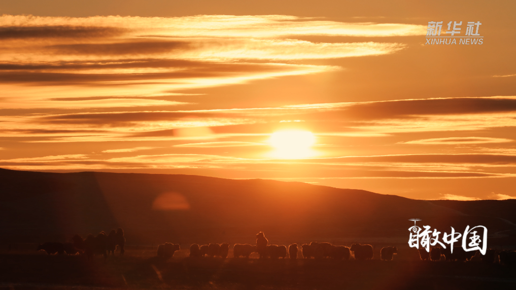 落日时分,余晖洒落,漫天雪花如碎金般飞舞。骆驼群沉稳徜徉,牦牛群悠闲食草,夕阳逆光中,它们的身影被镀上一层温暖的金边。雪原、生灵与落日相融,动静之间,勾勒出锡林郭勒草原浑厚又静谧的初冬画卷,尽显草原明珠的自然之美。