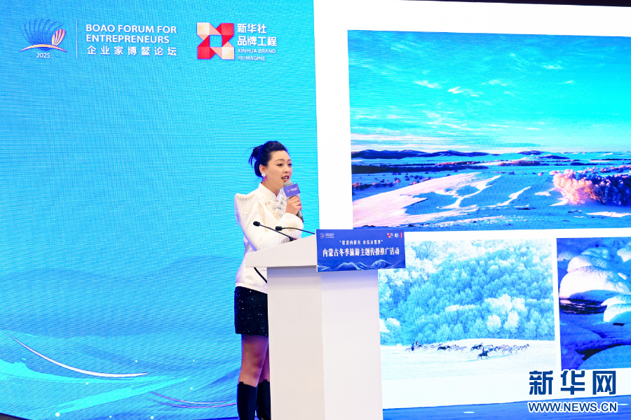 12月5日,何雨佳在2025中国企业家博鳌论坛“歌游内蒙古 欢乐冰雪季”内蒙古冬季旅游主题传播推广活动上作推介。新华网发