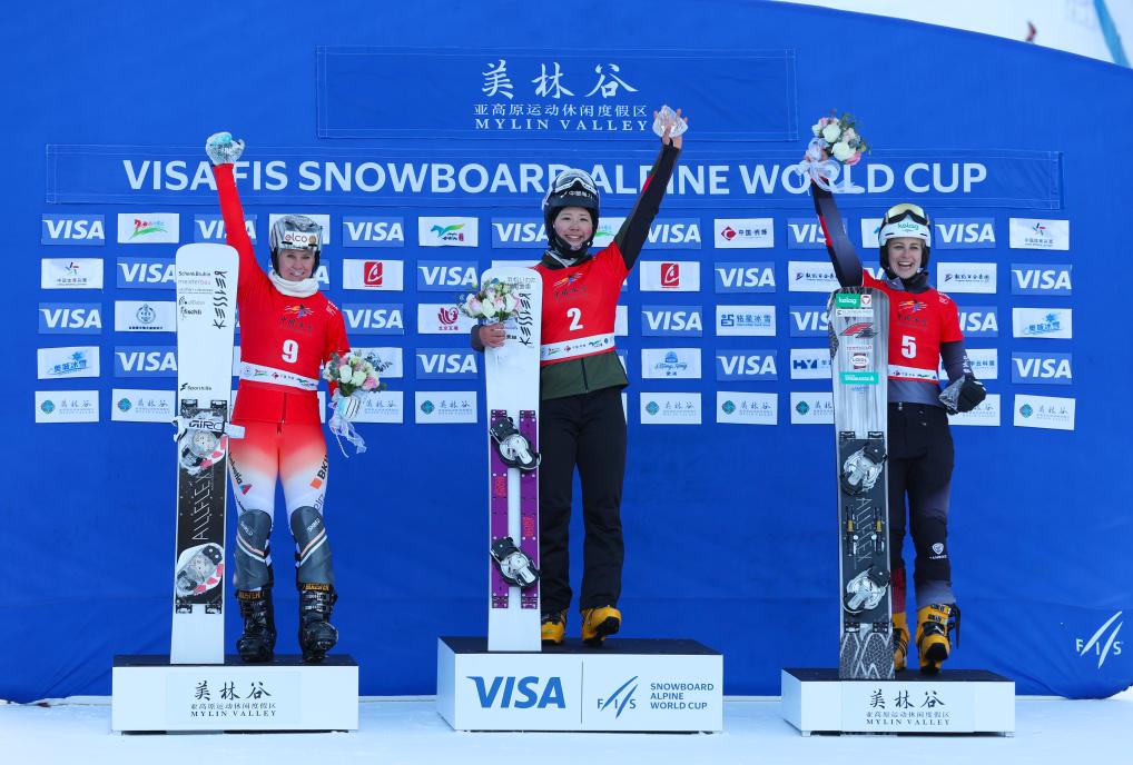 12月7日,女子组冠军日本选手三木椿(中)、亚军瑞士选手朱莉·佐格(左)、季军奥地利选手萨比娜·派尔在颁奖仪式上庆祝。