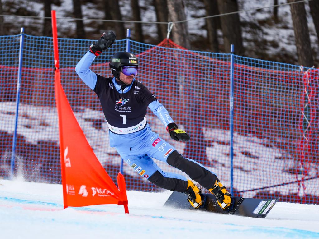 12月6日,男子组冠军意大利选手米尔科·费利切蒂(中)、亚军德国选手斯特凡·鲍迈斯特(左)、季军意大利选手毛里齐奥·博尔莫利尼在颁奖仪式上庆祝。 当日,国际雪联单板滑雪平行项目世界杯美林站平行大回转比赛在内蒙古赤峰市喀喇沁旗顺利收官。意大利选手米尔科·费利切蒂获得男子组冠军,日本选手三木椿获得女子组冠军;德国选手斯特凡·鲍迈斯特获得男子组亚军,意大利选手毛里齐奥·博尔莫利尼获得男子组季军;瑞士选手朱莉·佐格获得女子组亚军,奥地利选手萨比娜·派尔获得女子组季军。